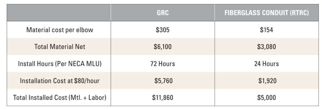Traditionally, project managers and engineers turned to GRC or galvanized rigid steel conduit when applications required large quantities of conduit elbows, common in utilities projects and data center builds. The example below shows how close to 50% savings on materials can be achieved when switching from GRC to fiberglass, and at a quantity of twenty 4” elbows nearly 60% overall savings can be achieved on total project costs: