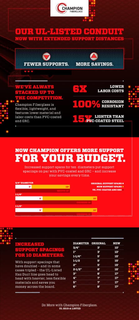 When it comes to material cost, lightness and ease of use, Champion Fiberglass has always been way ahead of other options. This infographic shows how UL-listed increased support spans put us on par with PVC-coated steel and GRC.