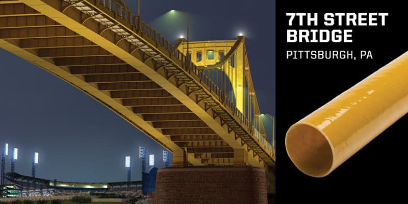 The bridge reopened in November, 2017, featuring conduit that not only matches the deep gold shade of the Seventh Street Bridge itself, it gives Pittsburgh residents a flash of hometown pride as they make their morning and evening commutes. With strong, reliable Champion Fiberglass as the electrical conduit of choice on this project, the city can look forward to this colorful conduit brightening up the Seventh Street Bridge while providing excellent, long-lasting protection for downtown Pittsburgh’s power supply.