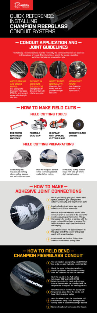 Due to its light weight and versatile design, installing Champion Fiberglass conduit is easier than installing other rigid conduit systems. Faster installs also contribute to lower overall costs. Use the guide below to get started, and check our Video Installation Guides for a more in-depth walkthrough.