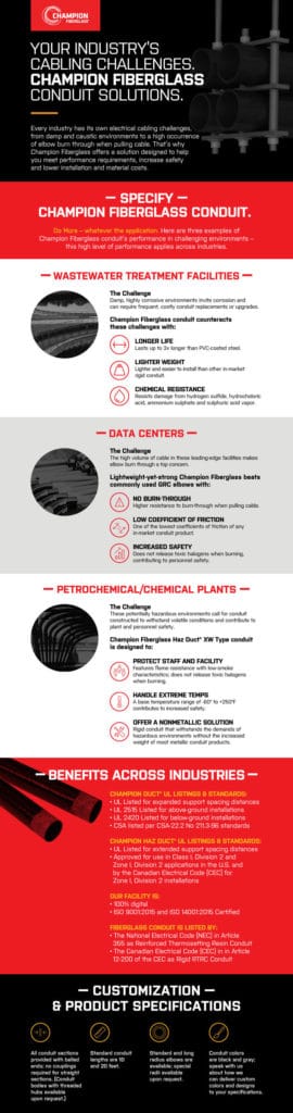 Every industry has its own electrical cabling challenges, from damp and caustic environments to a high occurrence of elbow burn through when pulling cable. That’s why Champion fiberglass offers a solution designed to help you meet performance requirements, increase safety and lower installation and material costs.
